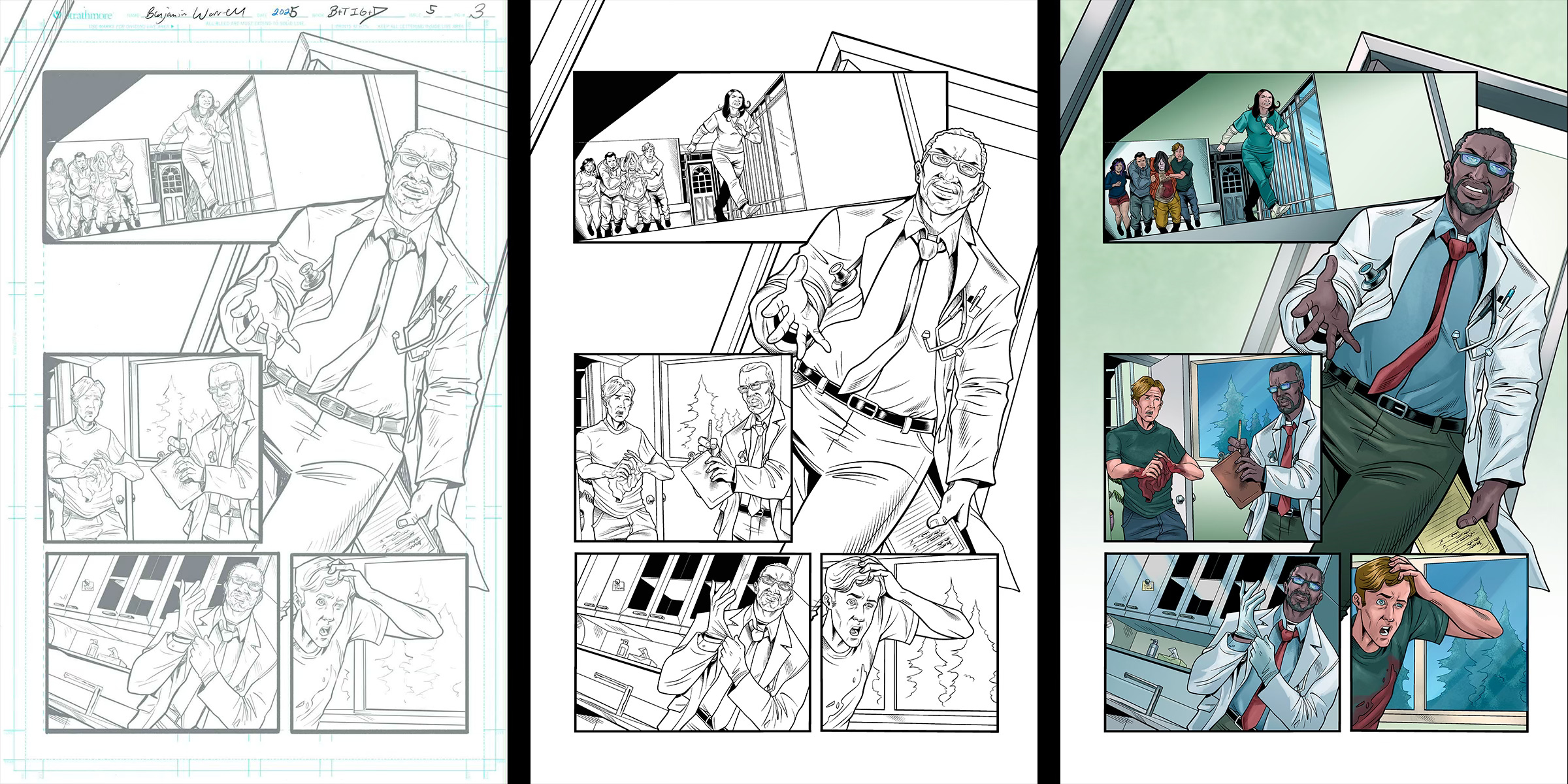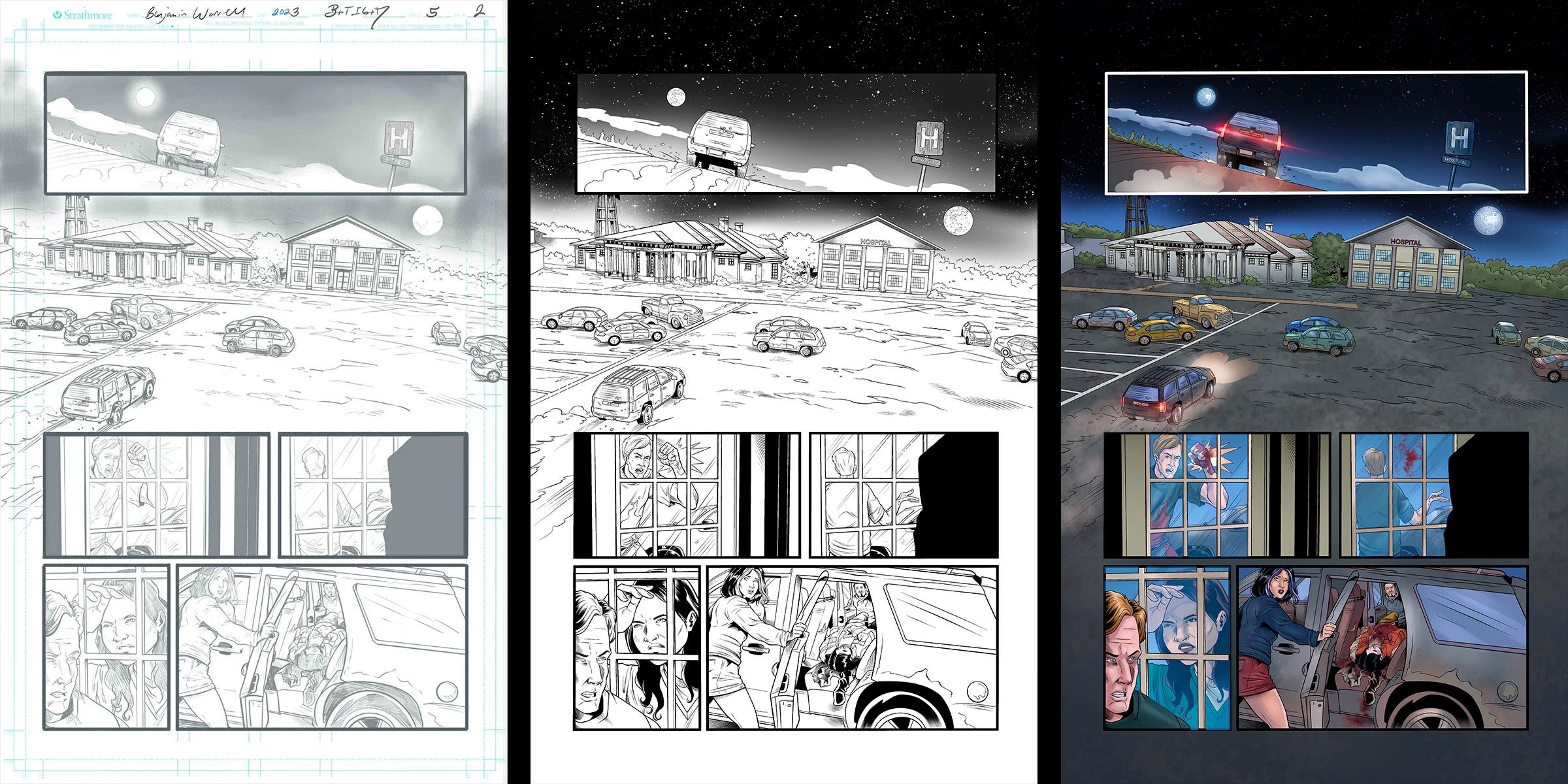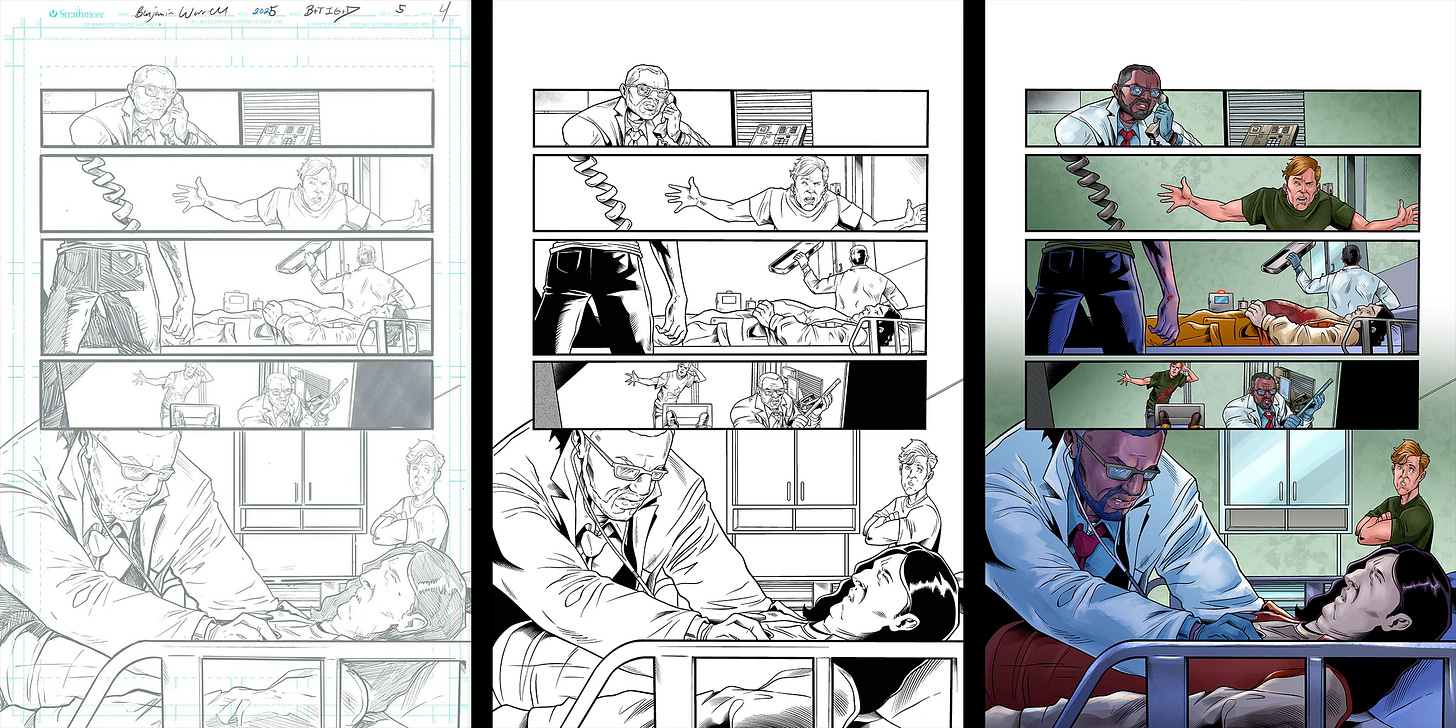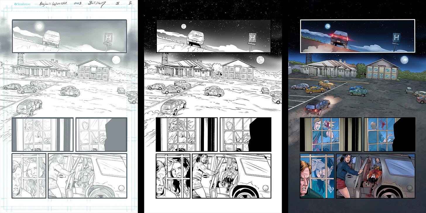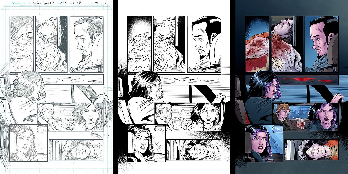 So, how’s it looking? Pretty goddamn awesome! If it’s okay with you, I’m going to reveal the first five pages of By the Time I Get to Dallas #5 art, featuring pencils by Ben Worrell, inks by Chis Arieswendha, and colors by Thaissa Dias. Ben returns from the last book, while Chis and Thaissa are new to the project and bring a brilliant precision and energy to the story. I’ll share each step for each page so you can see how it all comes together.