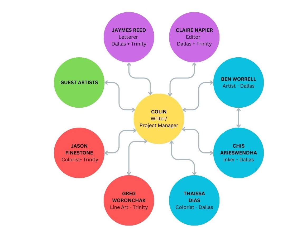 The hardest thing about being a comic book writer is that you can write all you like, but it means nothing until an artist actually draws for you. The wonderful flipside, however, is you can have half a dozen talented artists—from Colorado to Brazil to the Philippines—all working on your ideas while you watch soccer and make dumb bubble maps on Canva: